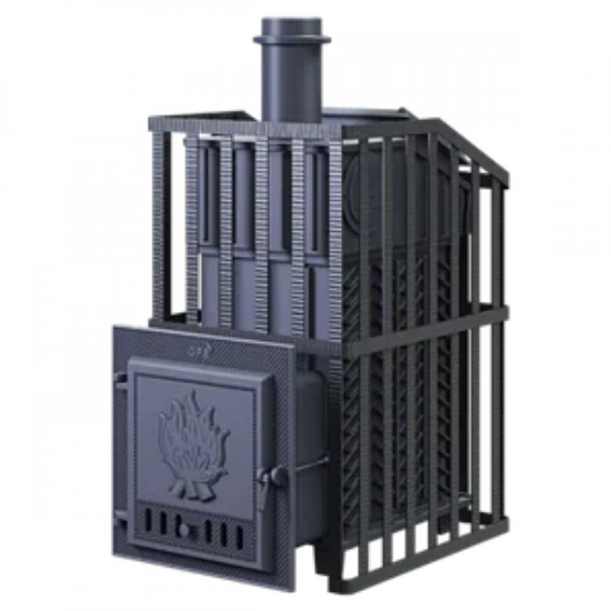 GFS-ЗК в сетке 30 Ураган - расширенный комплект печи GFS-ЗК в сетке. Максимально приближенный вариант печи для режимов русской парной, имеющий непосредственно закрытую чугунным коробом каменку, дверцу для пара с ручкой из бука, увеличенную до 50см чугунную стартовую трубу. Печь легко модернизируется до полноценной печи предназначенной для Русской бани путем замены стальной сетки на каменную облицовку без демонтажа дымохода.